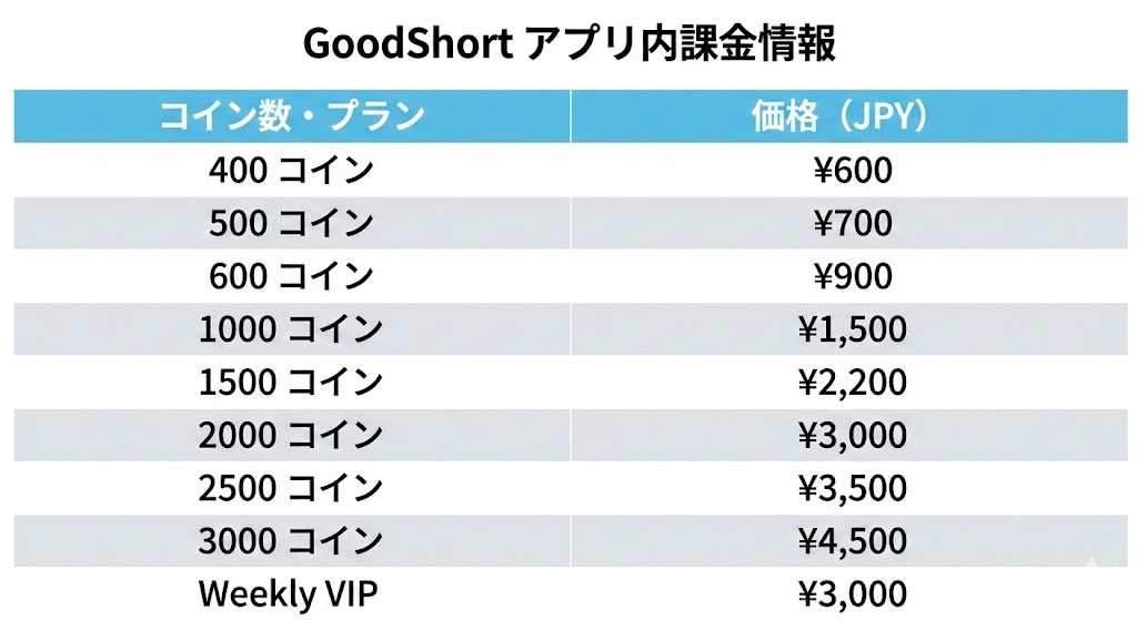 GoodShortアプリ内課金情報を表にまとめたものです。